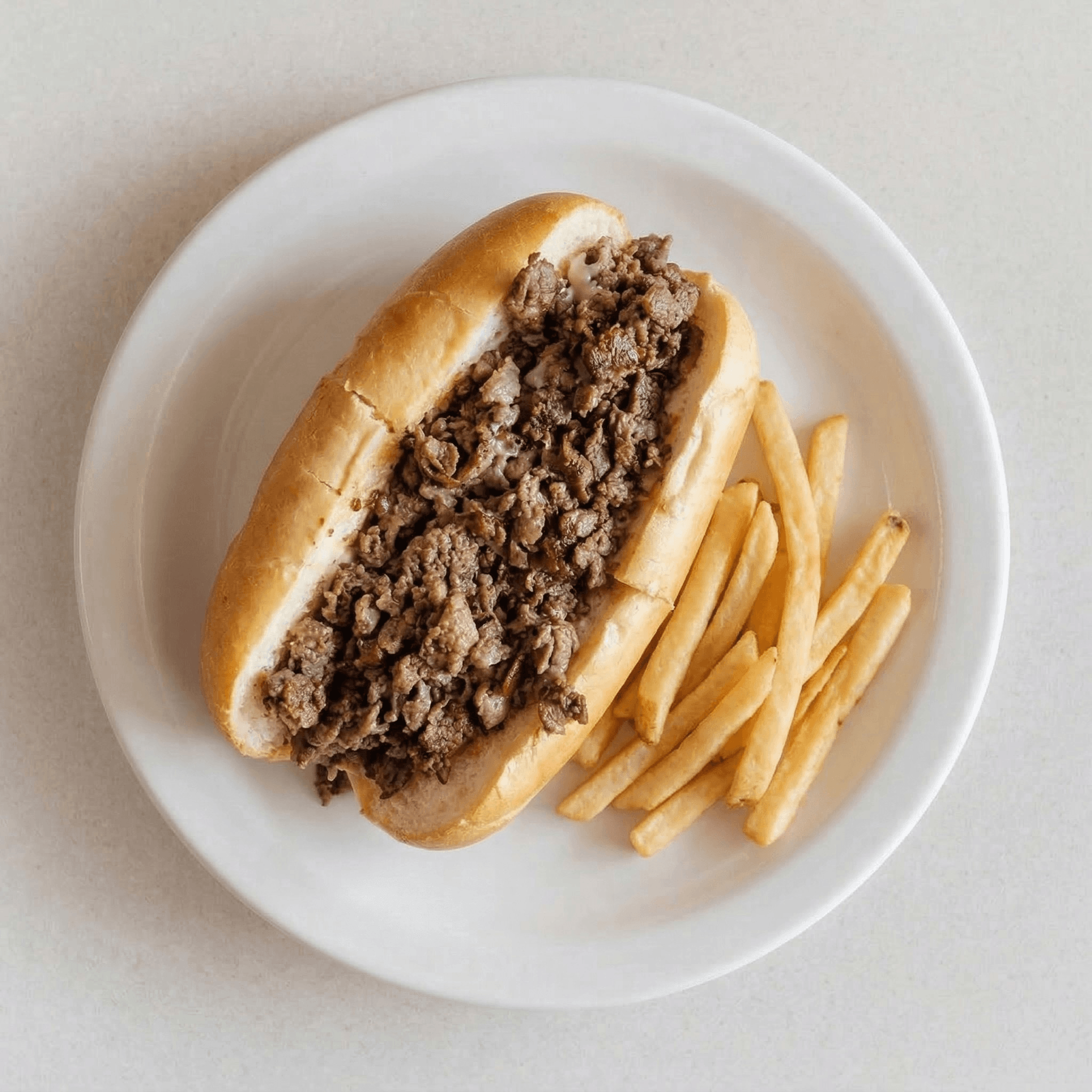 Grilled steak, American cheese, lettuce, onions, tomato, mayonnaise. Served with fries.