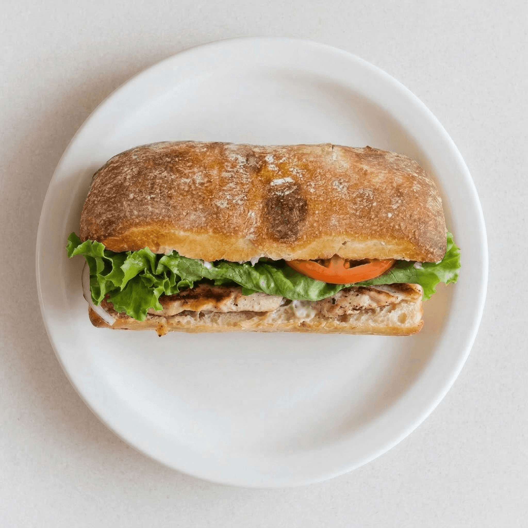 Grilled chicken breast, lettuce, tomato, red onion, pesto mayonnaise, oven fresh ciabatta bread