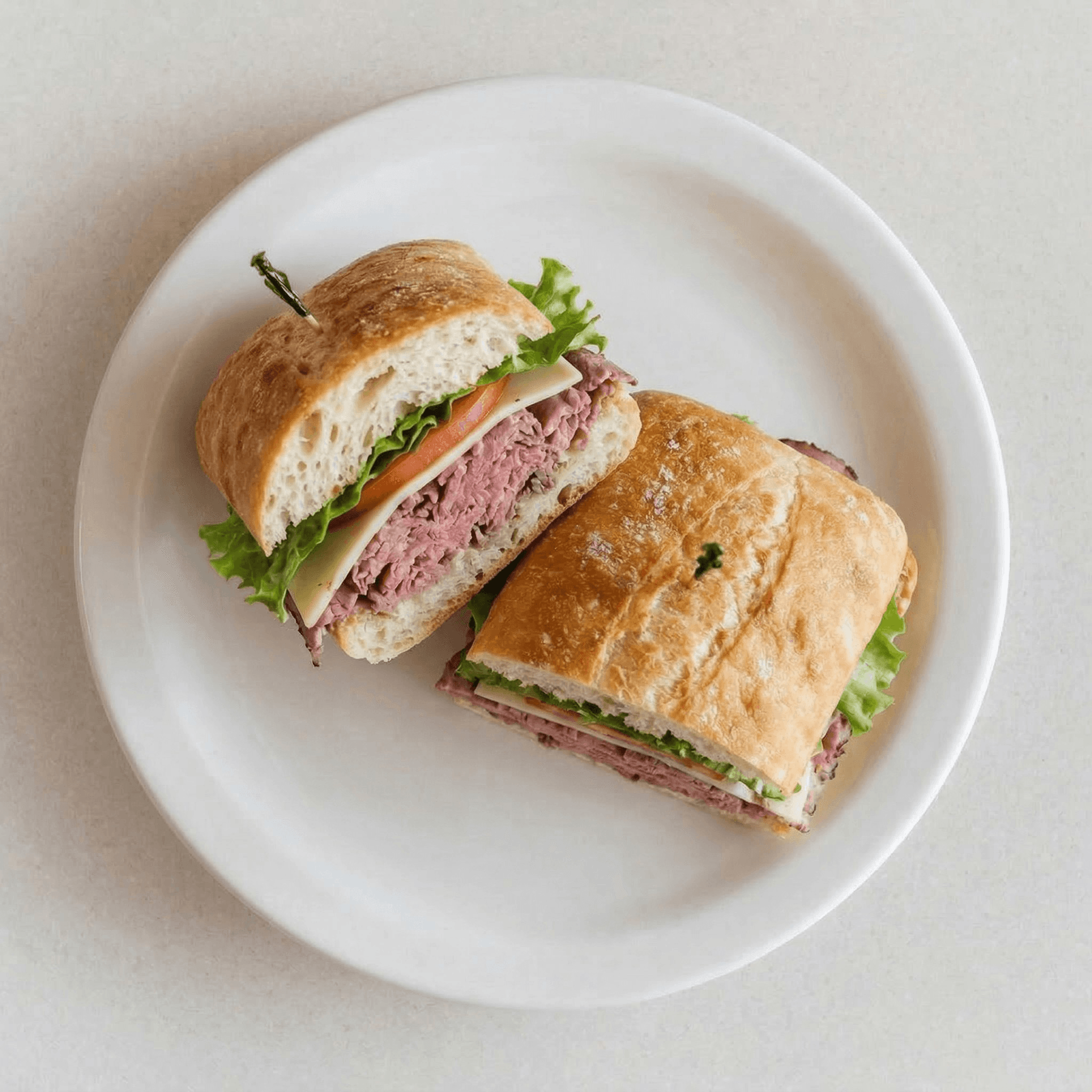 Roast beef, Swiss cheese, horseradish sauce, lettuce, tomato, red onion, oven fresh ciabatta bread